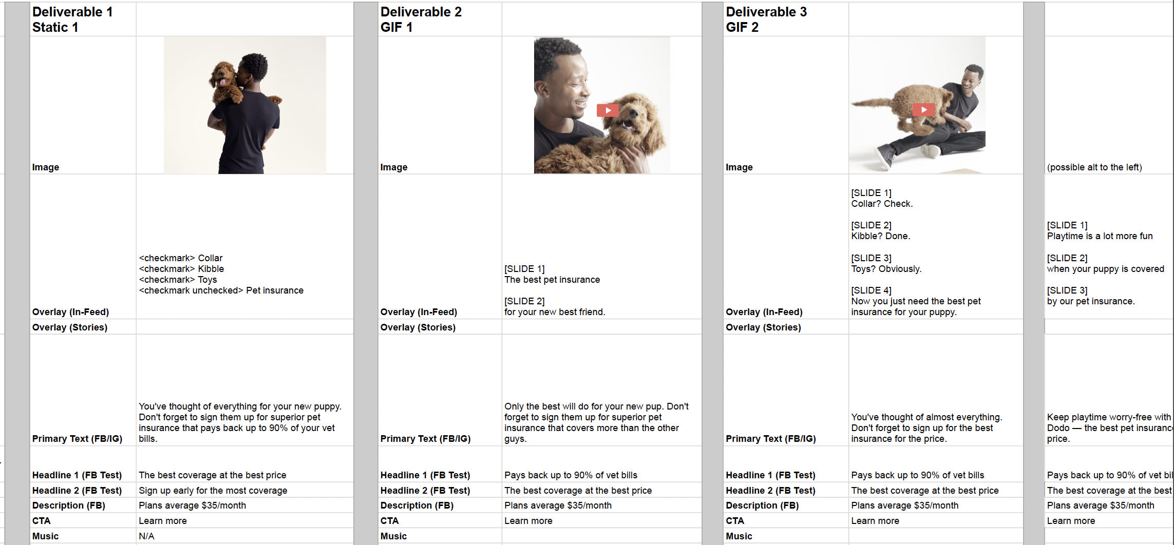 Messaging-wise, this was one of the more complex projects I’d taken on. Fetch had split the audiences across demographics, marketing funnels, and even whether a viewer has adopted from a shelter or not. And they wanted both gifs and videos.